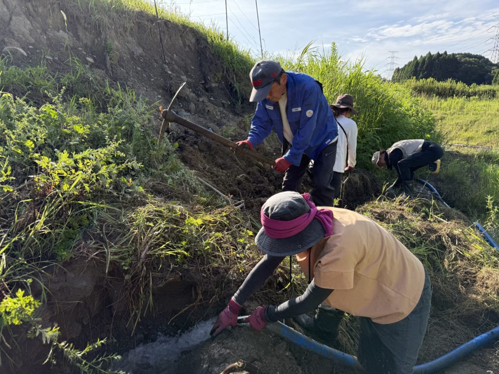 そこで、いつも黒川の応援をしてくださるセカイムラ米部の皆さんなどへ声をかけ、水路に関わる地元の皆さんと一緒に、排水や導水確保のための応急処置を行いました。